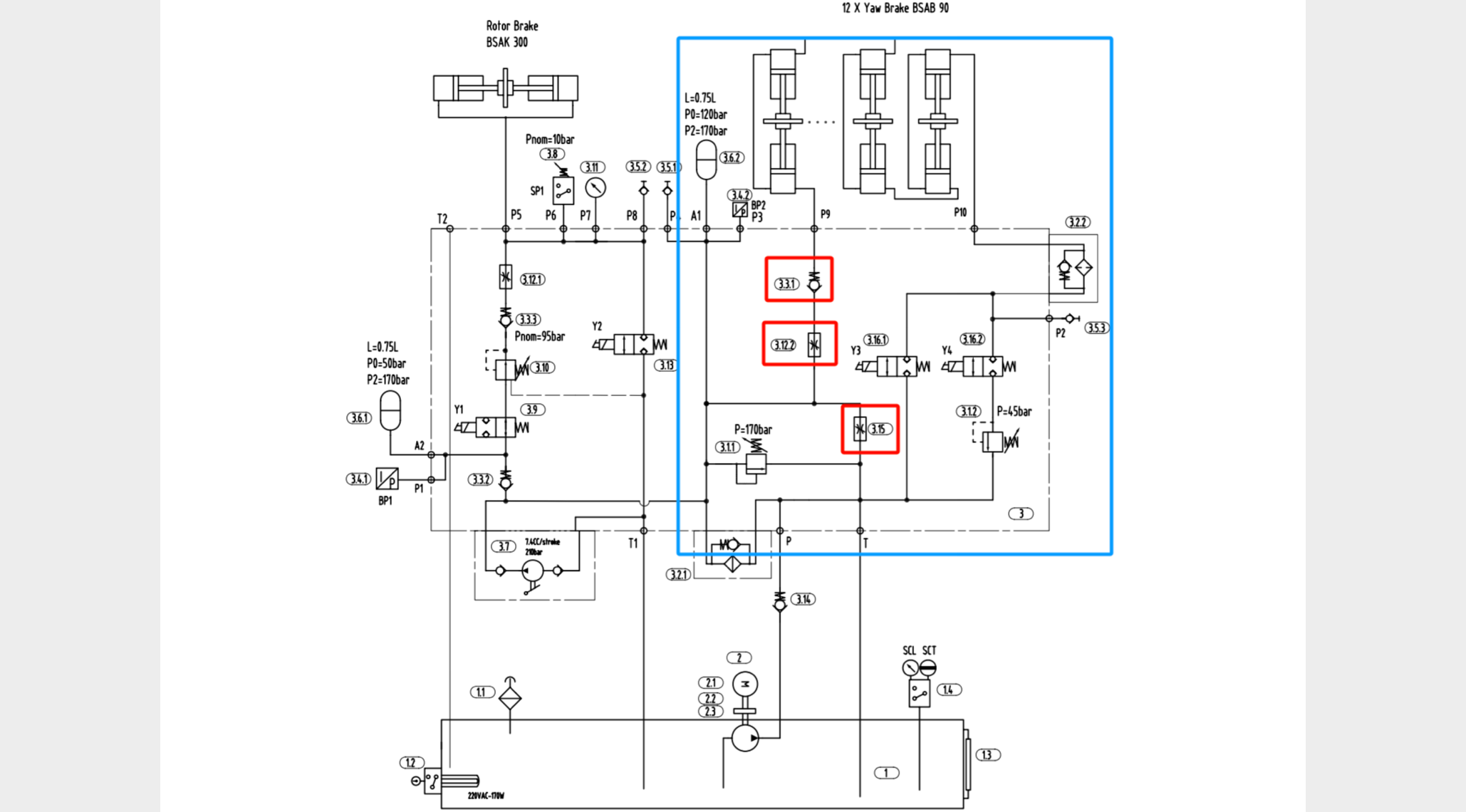 3、触发条件:在运行模式下,在不进行解缆和偏航泄压时,主系统压力低于135bar,并持续15秒后,触发此故障。