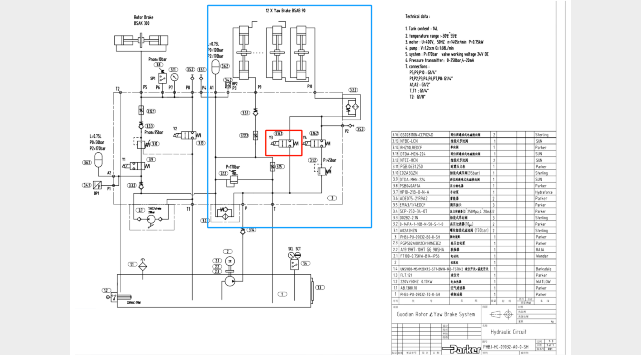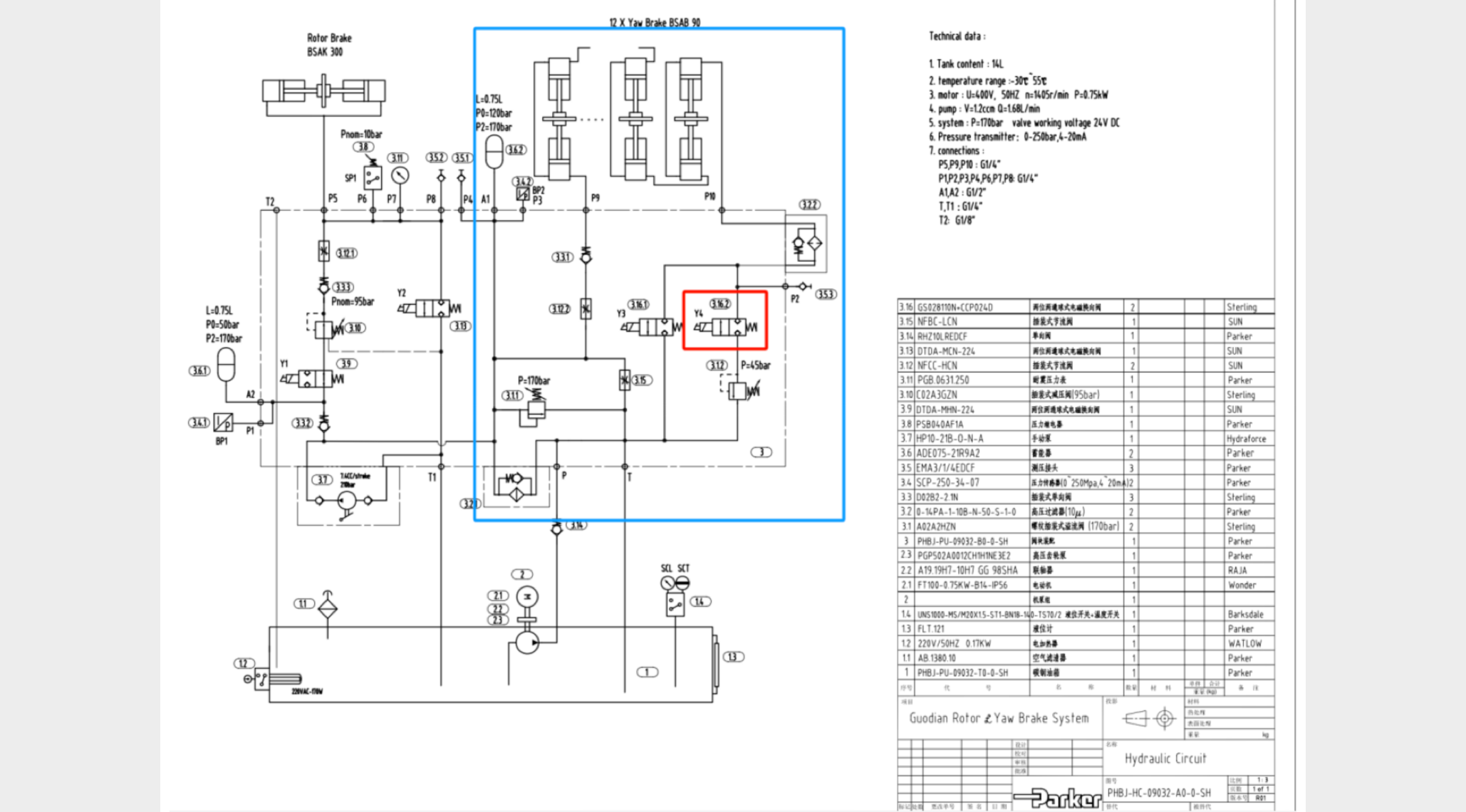 备件:液压油管、压力传感器(Parker SCP-250-34-07)、差分模拟量输入模块KL3404、插装式节流阀(SUN NFCC-HCN)、两位两通球式电磁换向阀(Sterling GS028110N+CCP024D)、齿轮油泵